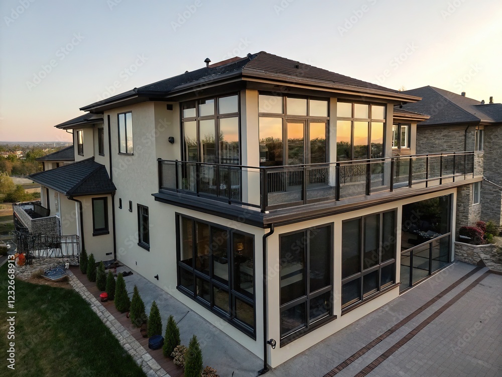 High-angle view of a protected home, its facade tinted for summer. #1232668913