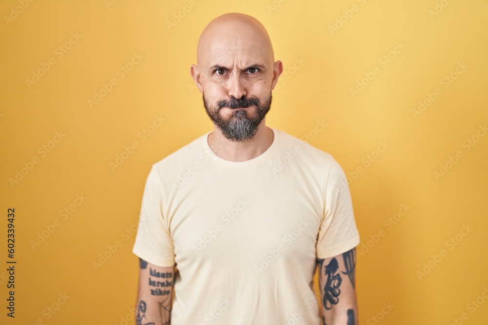 Hispanic man with tattoos standing over yellow background puffing cheeks with funny face. mouth inflated with air, crazy expression. #602339432