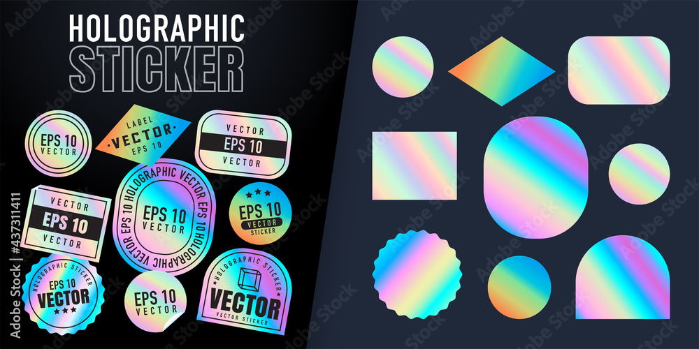 Holographic stickers. Hologram labels of different shapes. Colored blank rainbow shiny emblems, label. Paper Stickers. Vector illustration #437311411
