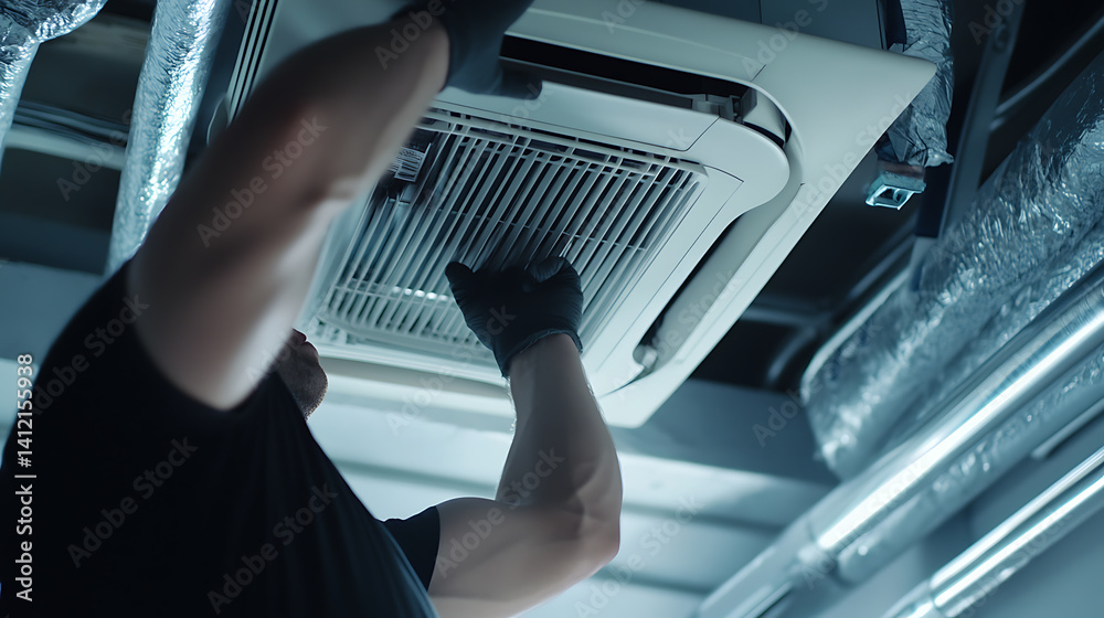 HVAC technician installing air conditioning system in commercial space. Featuring AC units and installation tools #1412155938