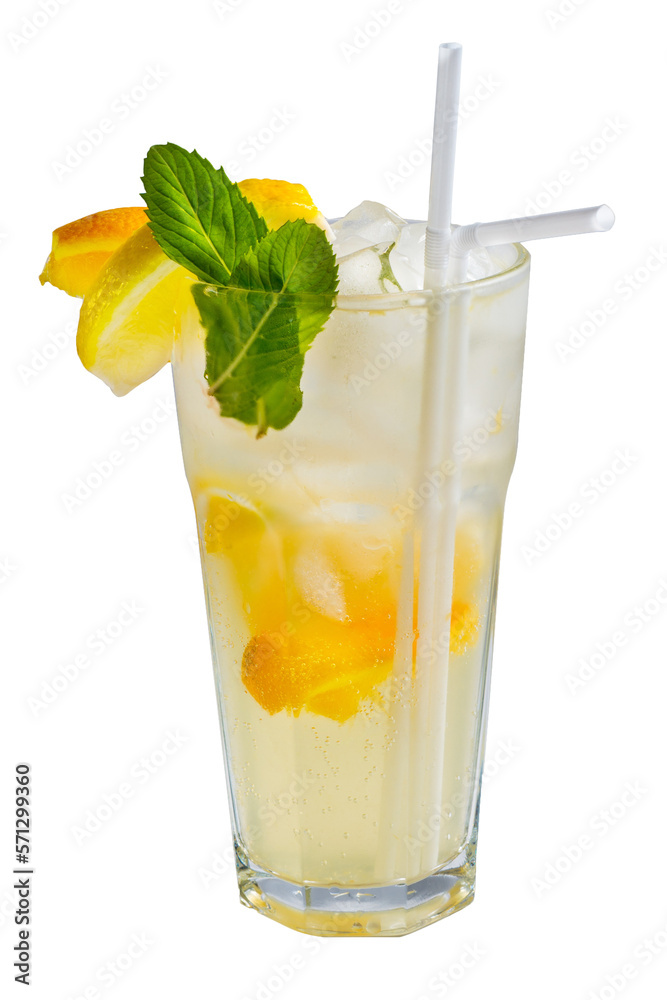 Lemonade with lemon slices and mint in a tall glass. Yellow cocktail with citrus #571299360