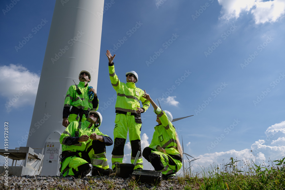 Maintenance engineer team standing at windmills at wind turbine farm. Group of people wear safety helmet and uniform working at alternative renewable energy wind station. Sustainable energy technology #1519572872