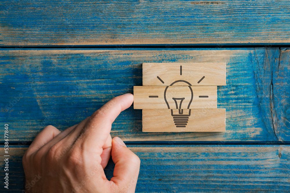 Male finger pushing a wooden peg into a stack of them to complete a light bulb shape drawn on them #538677840