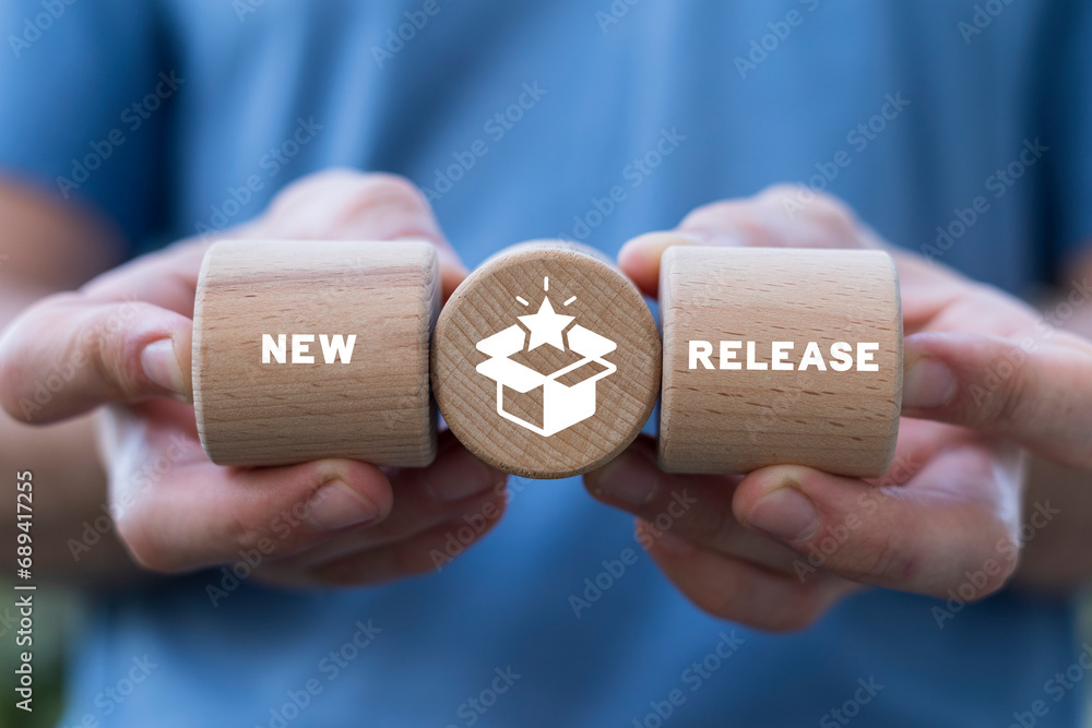 Man holding wooden blocks sees inscription: NEW RELEASE. New release concept. New product development. Coming soon announce. Update product version. #689417255