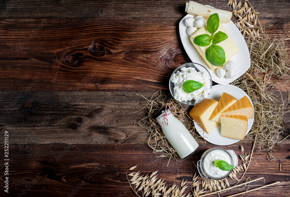 Many fresh dairy products in front of a rustic vintage background #252211129