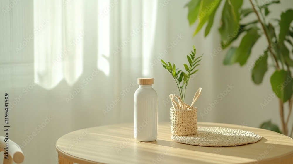 Minimalistic morning table setting with eco-friendly products and natural light in peaceful home environment #1195491509