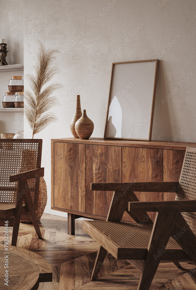 Mockup frame in minimalist nomadic interior background, 3d render #793228846