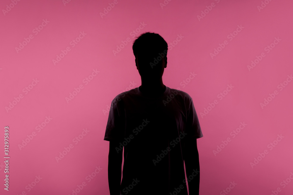 No name, anonymous person hiding face in shadow, human identity. Silhouette portrait of young man in casual T-shirt standing calm with hands down, indoor studio shot, isolated on pink background #312975893