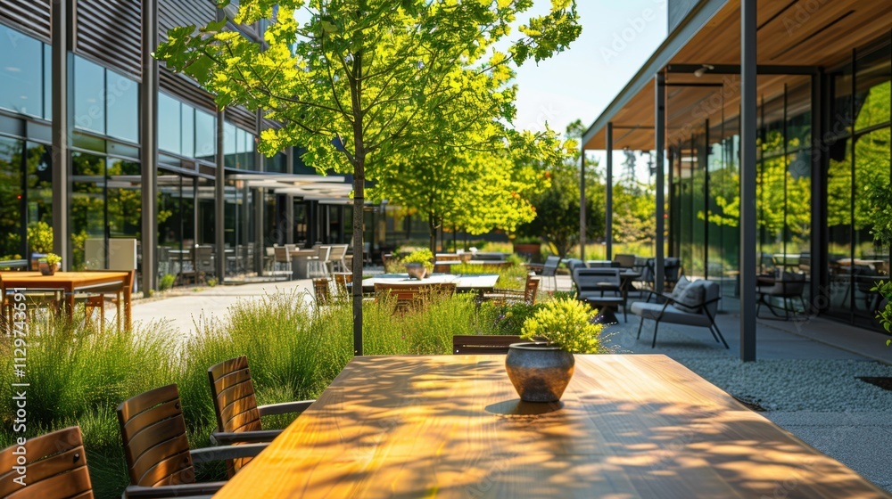 Outdoor Work Area: A tranquil outdoor space equipped with tables, chairs, and Wi-Fi access, allowing employees to enjoy fresh air while working productively. #1129743591