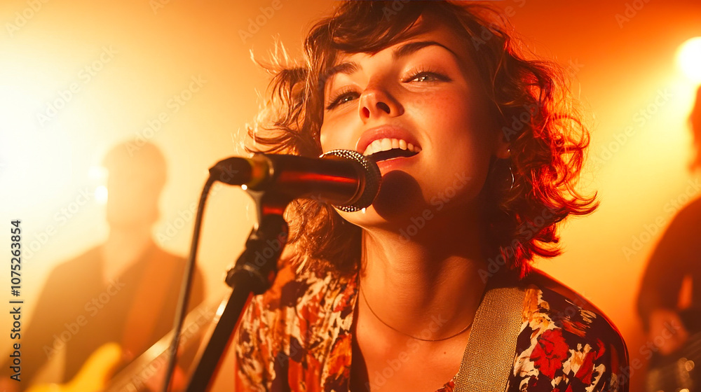 Passionate Singer on Stage: A captivating close-up of a female vocalist performing live, bathed in warm stage lighting, her expressive face and powerful voice filling the frame. #1075263854