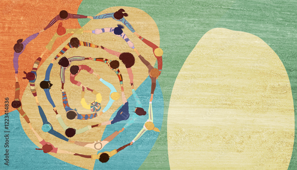 People group in circle from diverse culture holding hands.Teamwork and cooperation.Community of friends or volunteers committed to social issues for peace and the environment.Top view #1223414836
