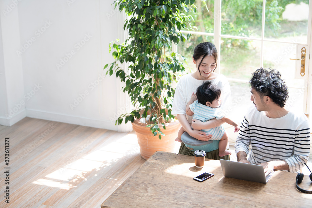自宅でリモートワークしながら子どもと会話するヒゲの中年男性とその家族 広角 コピースぺ-スあり #373611271