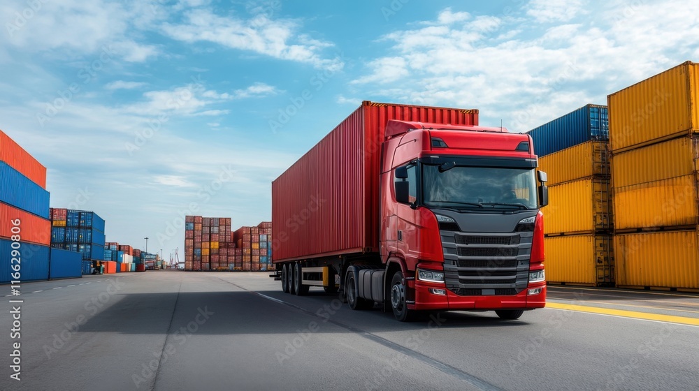 Red Truck Transporting Cargo in Container Yard Under Clear Sky with Colorful Shipping Containers #1166290806