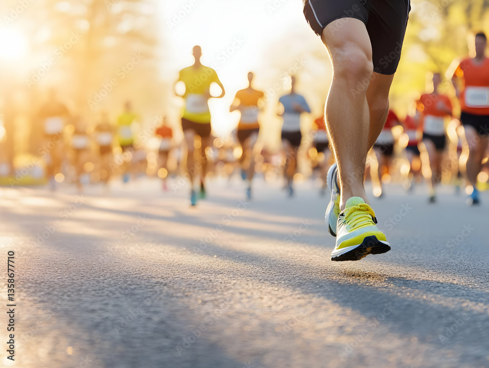 Runners compete in a vibrant marathon, legs and shoes in sharp focus against a blurred backdrop of fellow athletes and a sun-drenched road. The energy and motion of the race are palpable #1358677710