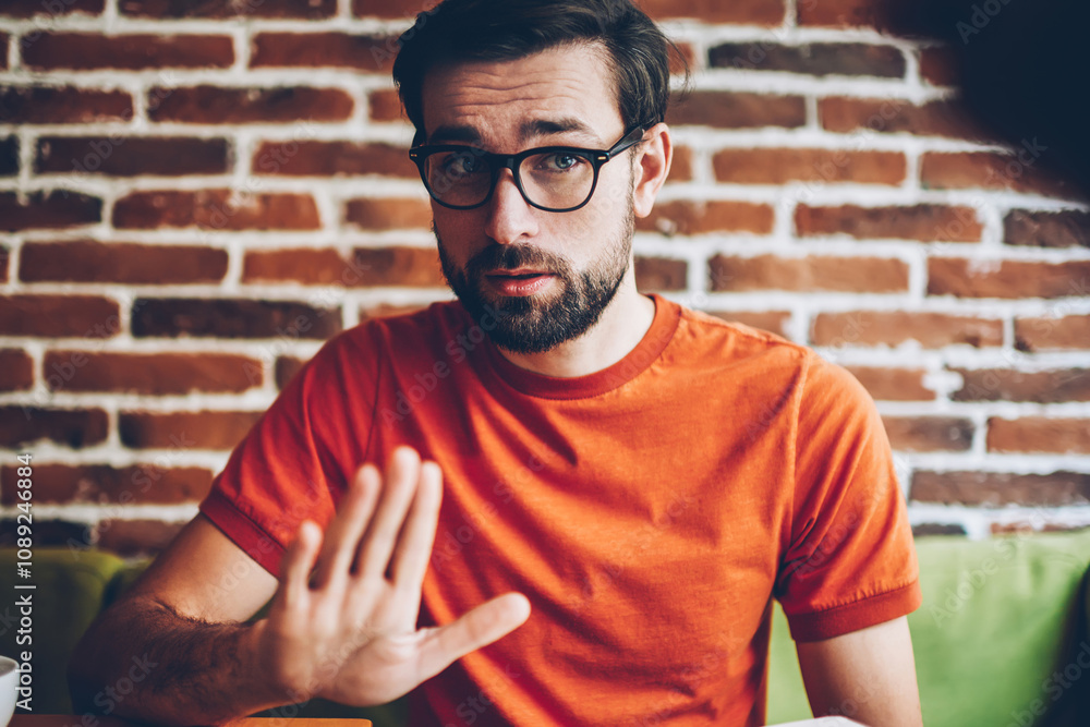 Sceptical hipster guy dressed in trendy orange t-shirt arguing during meeting.Young man with beard and eyeglasses for vision correction showing sign stop sitting in stylish coworking space #1089246884