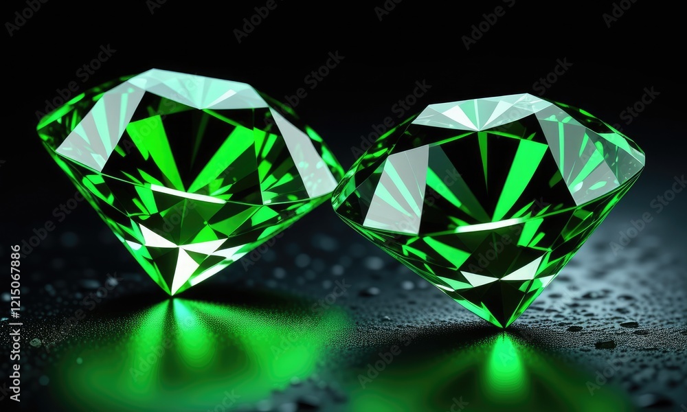 Sparkling green emeralds on dark surface with reflective highlights and raindrops #1215067886