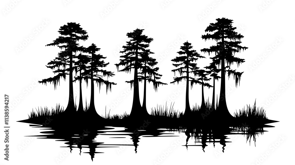 Swamp cypress trees with knees growing in a bayou, Vectorized Plant Art #1138594217