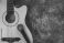 Table top view of music instrument tools concept background.Flat lay of sign to sing for musician or party equipment.Guitar with microphone on modern grey cement.copy space for creative design. #335565965