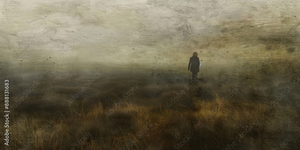 The Lost Vision: A misty landscape obscures the once grand view, as a solitary figure struggles to find their way. #888131683