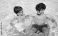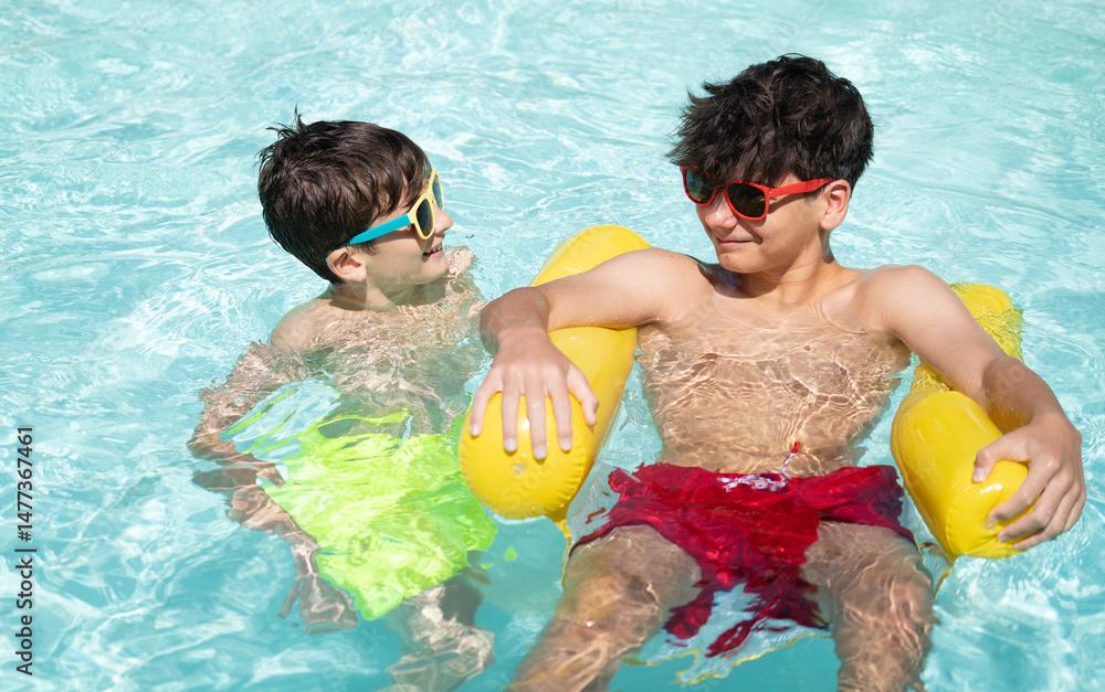 Two brothers wearing sunglasses are enjoying their summer holidays, playing in a swimming pool with an inflatable pool mattress #1477367461