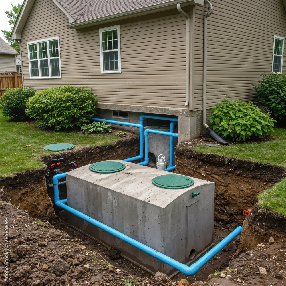 Underground Septic Tank System: A detailed view showcases a newly installed underground septic tank system, complete with a tank, pipes, and connections. #1285856951