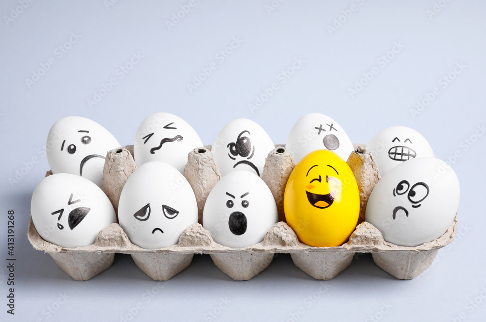 Yellow smiley egg among others with negative emotions in package on light background #413191268