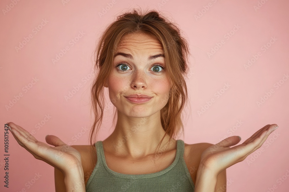 Young woman showing i don't know gesture with doubtful face expression #1055175471