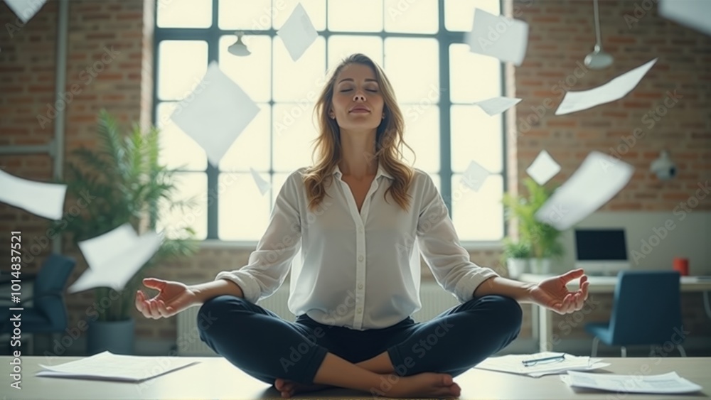 A businesswoman meditating in a modern office with papers floating around her, symbolizing calmness and balance in a chaotic work environment. The scene highlights mindfulness and stress relief. #1014837521