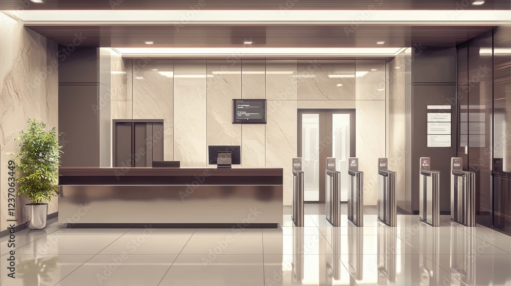 A contemporary reception area showcases polished floors and stylish furnishings. The space includes a welcoming front desk, electronic visitor check-in, and security turnstiles #1237063449