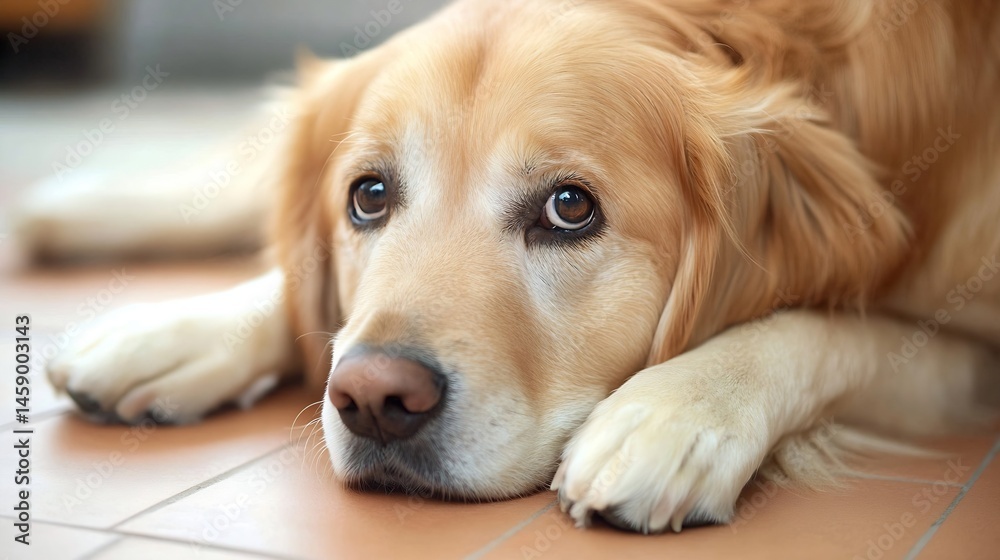 A golden retriever dog rests its head on the floor, its paws gently folded beneath it, gazing pensively into the distance with soulful brown eyes. : Generative AI #1459003143