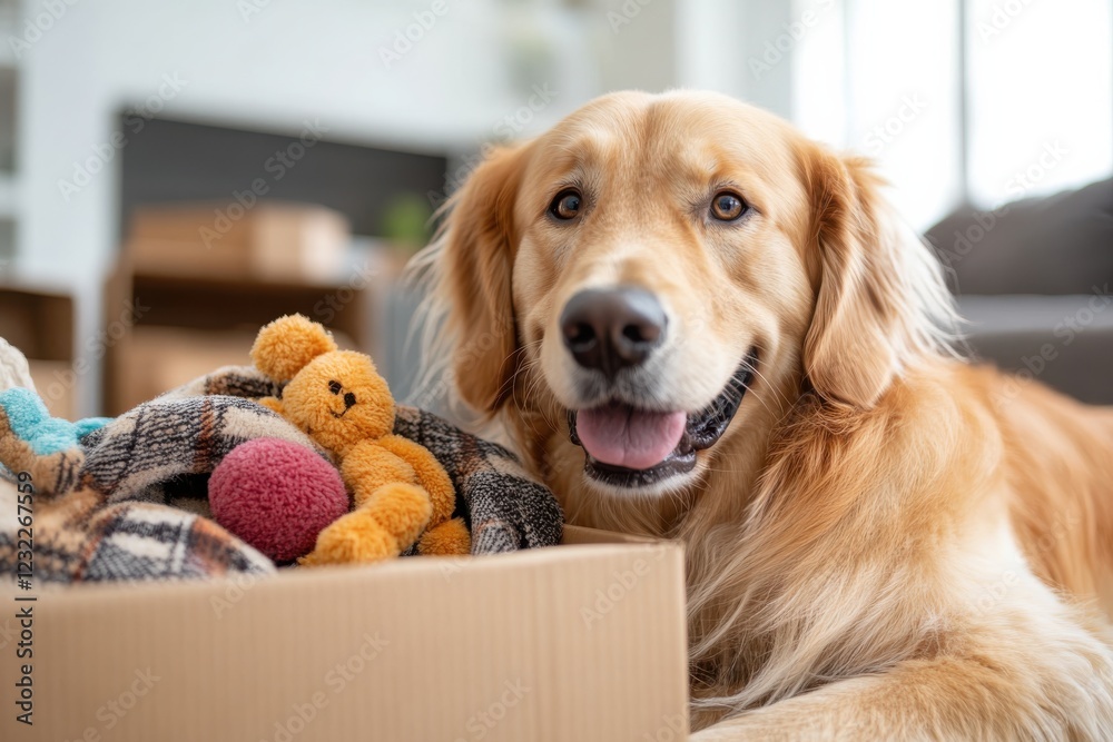 A golden retriever rests beside vibrant plush toys in a cardboard box, highlighting the playful spirit and affectionate nature of dogs within a bright, cozy home setting. #1232267559