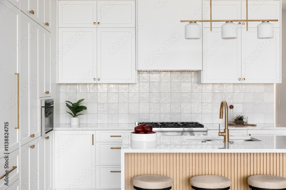 A kitchen detail with white cabinets and square tile backsplash, a waterfall marble countertop and wood slat panel front, and a gold light fixture, hardware, and faucet. No brands or labels. #1138824715