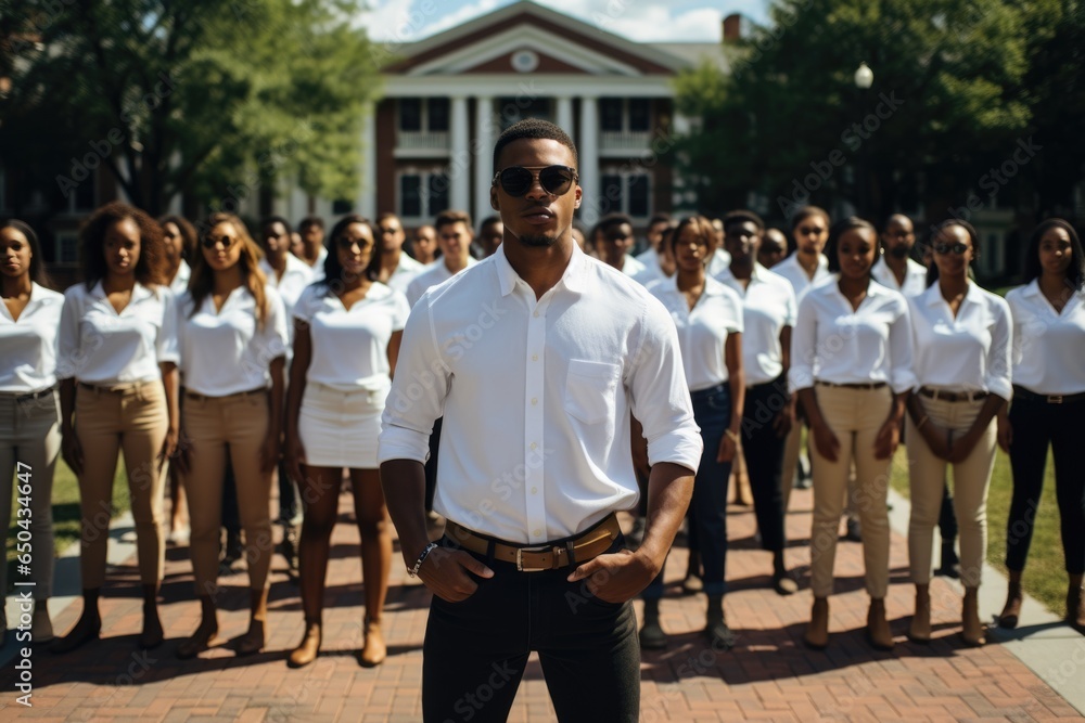A man standing in front of a group of people. AI image. Imaginary club, fraternity group. #650434647