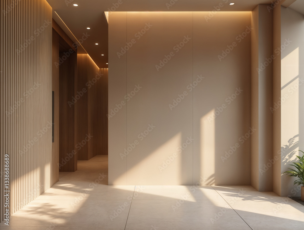 A modern interior with light-colored walls and floors, a wooden slatted wall on the left, and natural light streaming in, creating a serene ambiance. #1338688689