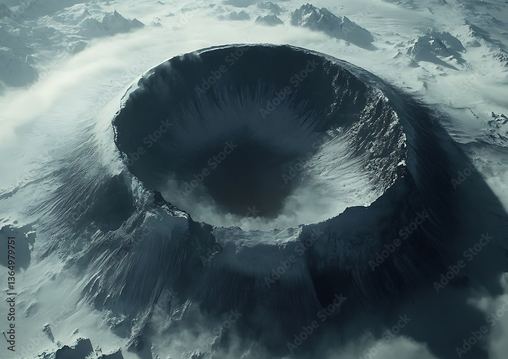 Aerial view shows a large volcanic caldera covered in snow #1364979751