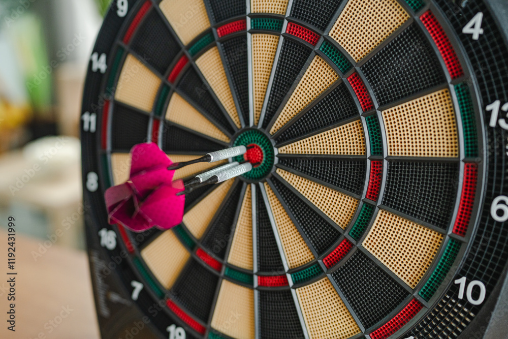 Bulls eye hit with three darts precisely in the target center spot #1192431999