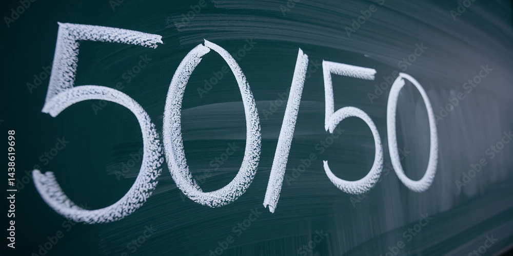 Chalkboard with white chalk inscription 50/50, representing choice, balance, or decision-making, ideal for educational or business contexts #1438619698