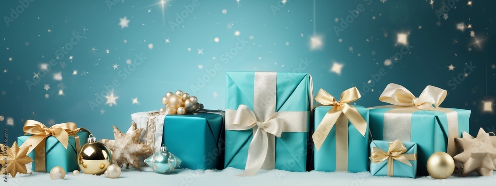 Christmas or birthday monotone background with turquoise presents and gold ribbon on turquoise background with stars. Advertising banner with space for text, copy space #683386273