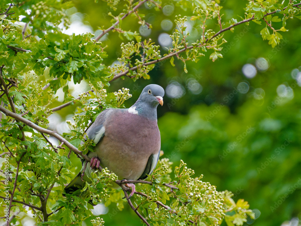 Columba palumbus or Common wood pigeon in a tree. Eating the new spring growth and buds. #808315509