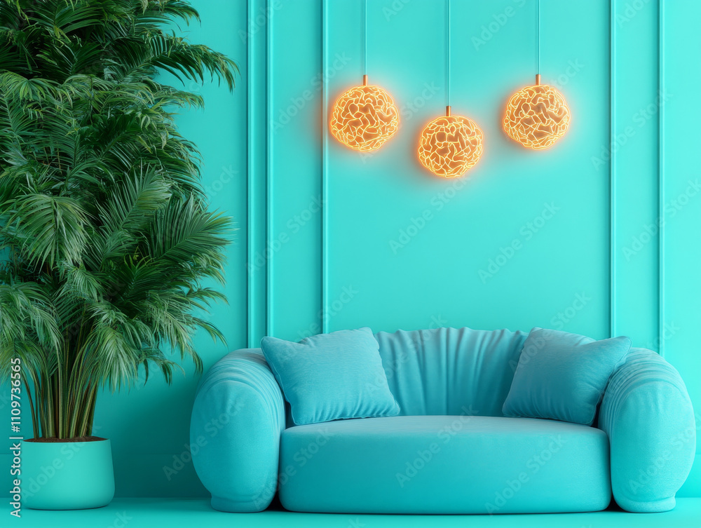 cozy turquoise room with plush sofa and glowing brain shaped lights. #1109736565
