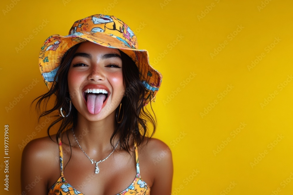 dame portant un chapeau seau tirant la langue à la manière chicano de Los Angeles, fond jaune #1197737908