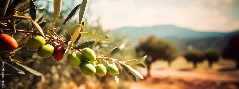 Delicious olives in a picturesque olive grove branch with olive fruits on the tree. Generative AI, #588845206