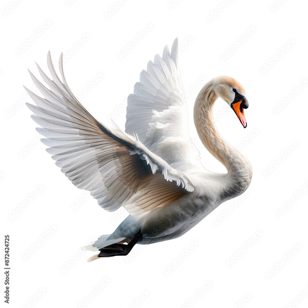 Elegant white swan in mid-flight with majestic wings spread wide, isolated on a white background, transparent background. #872424725