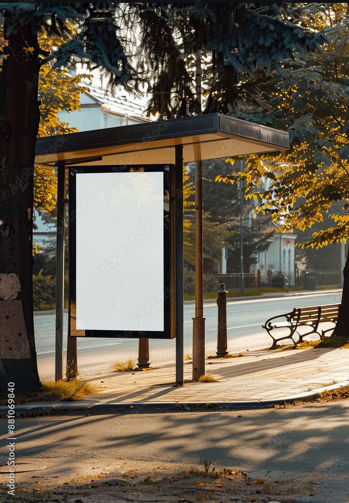 Empty Bus Stop Billboard on a Quiet Autumn Morning in a Small Town #881069840