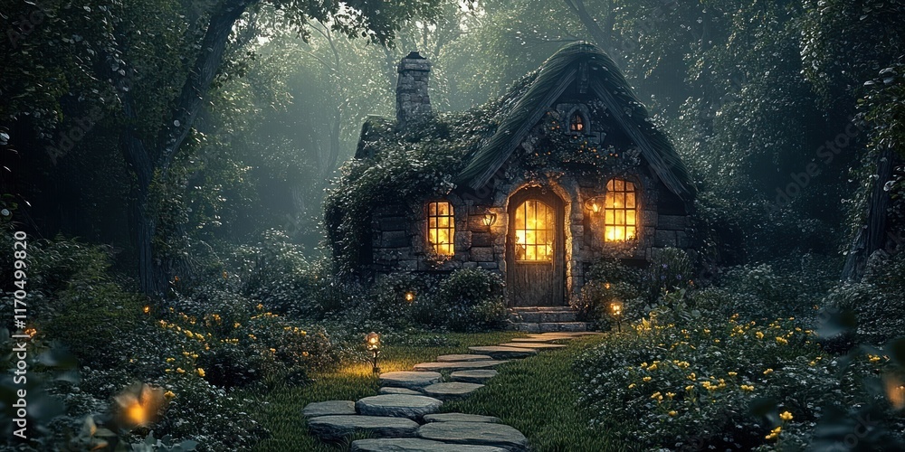 Enchanted Cottage in a Lush Forest with Twilight Glow and Dancing Shadows #1170499820