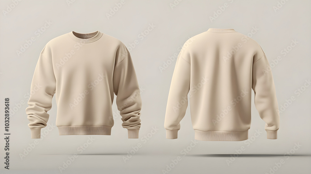 Front and back view of beige cotton crewneck sweater mockups #1032893618
