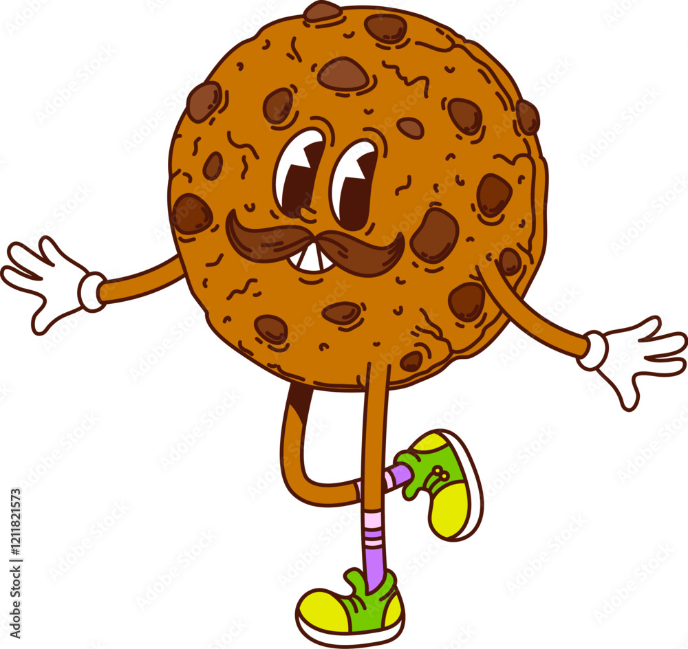 Funny chocolate cookie groovy hippie dessert, sweet or candy character with vintage mustaches, lively expression and retro sneakers. Cartoon vector round pastry with chocolate chips cheerfully dancing #1211821573