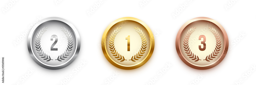 Gold, silver, bronze medal set. Champion trophy awards with numbers and laurel vector illustration. Prize in sport for winning first, second, third place in competition on white background #515611446