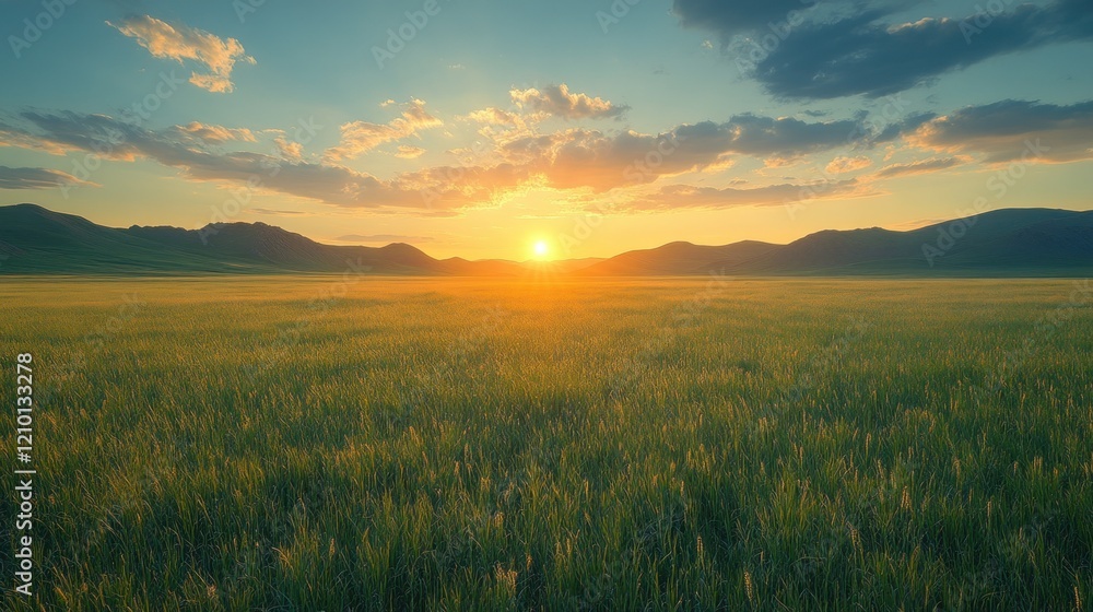 Golden sunset over a vast field of green grass with distant mountains under a cloudy sky #1210133278