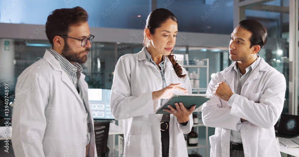 Group, scientist and meeting on tablet in lab for research, medical investigation and pharmaceutical report. People, explain and digital for planning, biology study and information for neurology exam #1394074897